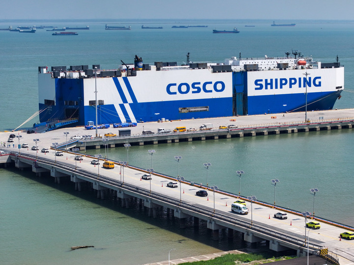 图为9月16日,装载3600余辆商品车的“玉衡先锋”号即将从江苏太仓港启程前往东南亚(无人机照片)