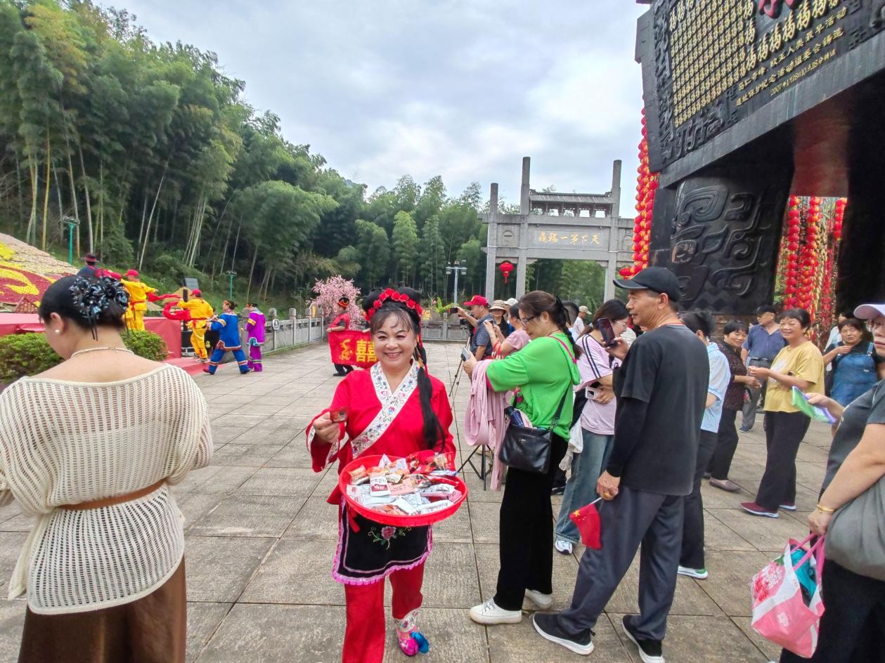 除了经典的黄梅戏表演,现场还别出心裁地安排了古代婚礼情景秀。当“新人”携喜糖从台上走入观众席时,瞬间点燃全场热情。游客们纷纷互动接糖,在欢声笑语中接住了这波节日的“喜气”。