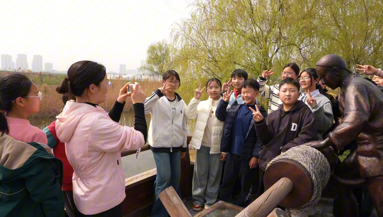 “同学们,请看我们脚下的这段河道,就是隋唐大运河通济渠段,距今已有1400多年的历史,是目前大运河全线唯一保持通济渠原貌的活态河段。”在讲解员罗飞翔的指引下,孩子们俯身触摸堤岸的石块,感受千年运河的温度。运河边,几株老柳吐露新芽,微风吹过,柳枝轻拂水面,仿佛在诉说着当年的漕运繁华。